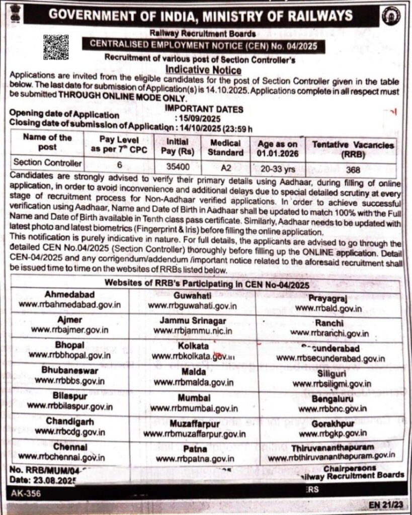 RRB Section Controller Recruitment 2025 of various post 368 रेलवे में करियर बनाने के इच्छुक स्नातक युवाओं के लिए बेहतरीन अवसर है। यह पद न केवल आकर्षक वेतन देता है बल्कि रेलवे ऑपरेशन्स की अहम जिम्मेदारी भी प्रदान करता है। यदि आप पात्रता मानदंड पूरे करते हैं और मेडिकल फिटनेस में सक्षम हैं, तो यह भर्ती आपके लिए सुनहरा मौका साबित हो सकती है।
